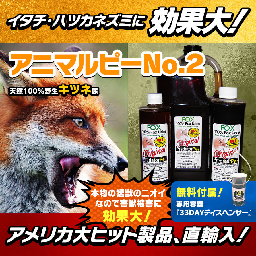 アニマルピーNo.2(天然フォックス尿=天然キツネ狐尿)は、フォックス(キツネ/狐)を「天敵」として本能的に避ける先天的習性(獣尿の「マーキング効果」)を利用し、鼬(イタチ/いたち)、小型ネズミ/ねずみ/鼠(ハツカネズミ等)、モグラ(もぐら)などの害獣を傷つけずに寄せ付けなくする製品です。