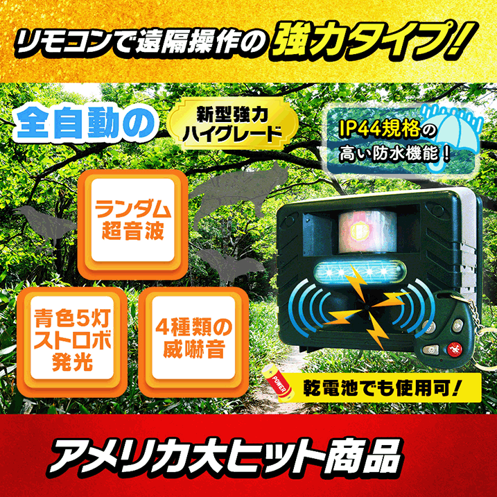 【全自動】の【(強力な)ランダム変動の超音波】【青色LED5灯ストロボ発光】【4種類の威嚇音(強弱の調整も可能)】の「3大機能(トリプル・パワー)」がコンパクトな一台に集約された、「アメリカ最新技術」搭載『アメリカ大ヒット製品』のハイテク“新型強力モデル”で、