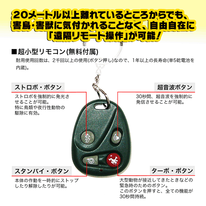 【全自動の】(ランダム変動の)強力な超音波などの【3大機能(トリプル・パワー)】が、(無料付属の)【超小型リモコン】にて、20メートル以上離れたところからでも、(<<カラス・ハト・ムクドリなどの害鳥・害獣に一切気付かれることなく>>)、自由自在に【遠隔リモート操作】が可能なので、結果として、より強力にカラス・ハト・ムクドリなどの害鳥・害獣の撃退が可能!
