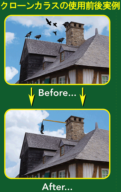 (3)我が家は、どういうわけかカラスの被害がとても多く、春先などには子供が玄関や庭に来たカラスに突かれてケガをする被害まであったくらいです。「防鳥クローン・カラス」を庭と家の入り口の左右に3台吊したら、カラスだけではなく、カラス以外の小さな鳥にも大きな効果がありました!「防鳥クローン・カラス」は、思っていた以上に本物ソックリかつリアルで、初めは、私自身もビックリしました。(東京都・男性)