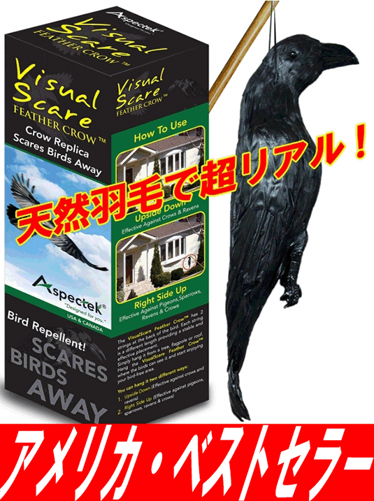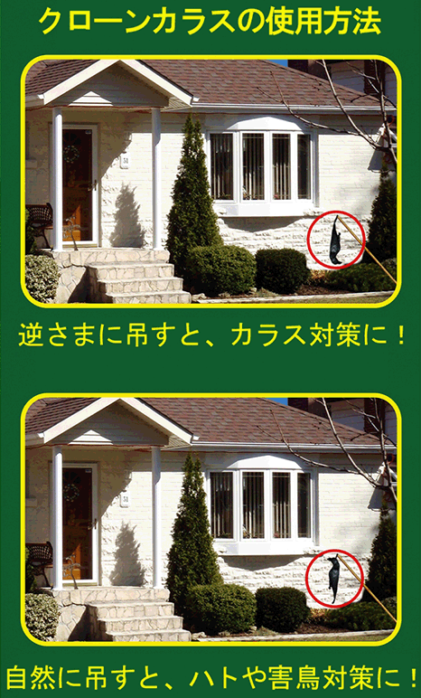 ※まっすぐに吊せば、「恐るべき獰猛な肉食系鳥である、生きたカラスがいる!」と見せかけることにより、ハト・ムクドリ・ヒヨドリ・スズメ・ツバメなどの小さな鳥類に対して、“危険シグナル”を与え、その周辺に、ハト・ムクドリ・ヒヨドリ・スズメ・ツバメなどの小さな鳥類を寄せ付けにくくします。