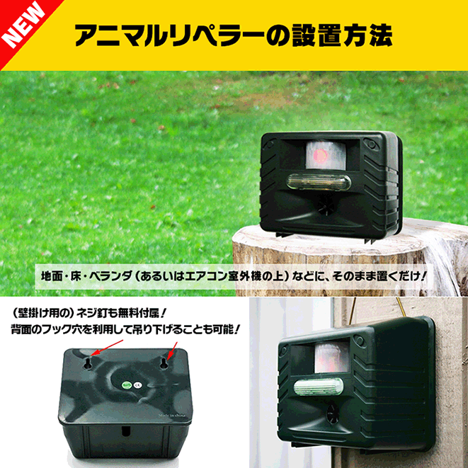 (3)以前は、中国大陸の中国業者が販売してるソーラー・タイプの類似品を使っていたのですが、曇りや雨の日は全く使い物にならず、しかもソーラー部分に雨水が浸入してすぐに壊れてしまったので、こちらのNewアニマルリペラーに買い換えました。このNewアニマルリペラーは、さすがに「アメリカ大ヒット製品」だけあって、天候にも全く左右されずに、ずっと駆除パワーが全く衰えず何年間も長年使えるし、ソーラー・タイプに比べて明らかに「超音波パワー」も格段に上なので、本当に良いですね!また、「昼間/夜間のみ作動」のスイッチも付いていて、節電にもなり、とても便利です。(埼玉県・女性)