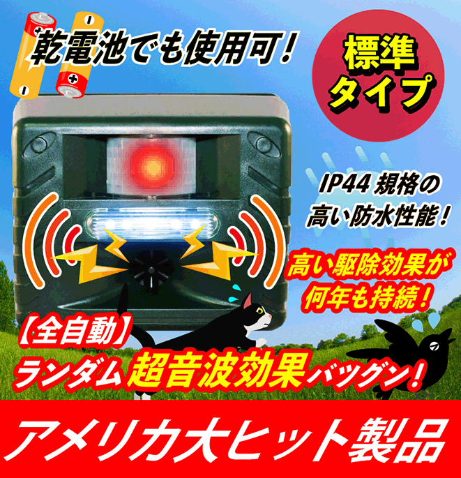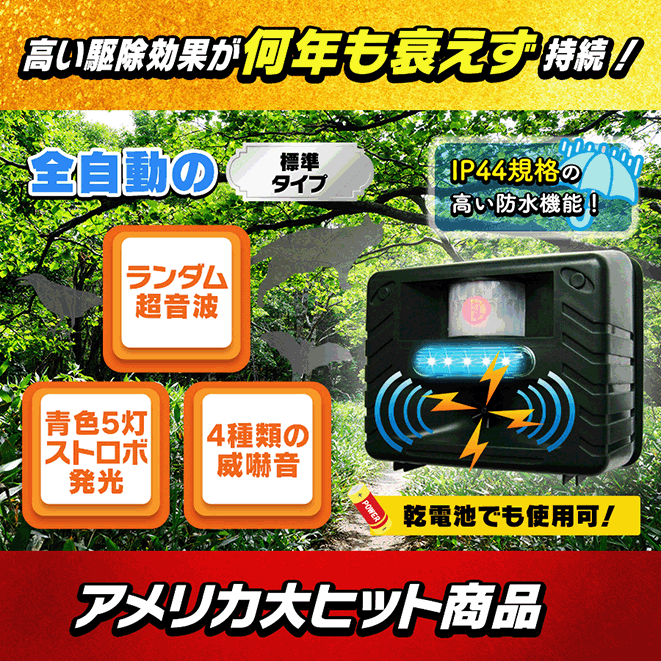 【全自動】の【(強力な)ランダム変動の超音波】【青色LED5灯ストロボ発光】【4種類の威嚇音(強弱の調整も可能)】の「3大機能」がコンパクトな一台に集約&標準搭載の『アメリカ大ヒット製品』の標準タイプ!