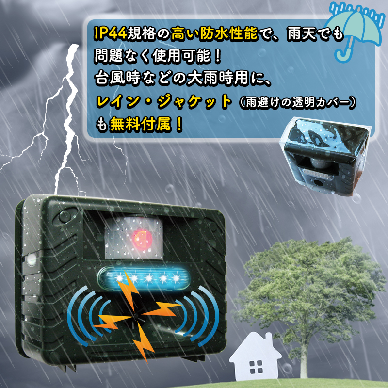 『Newアニマルリペラー』は、(元々、屋外/野外での長期使用に耐えることを主眼にアメリカで開発された機器ですので)、高性能の【防水性能:IP44】なので、もちろん、雨天時でも問題なく使用可能!