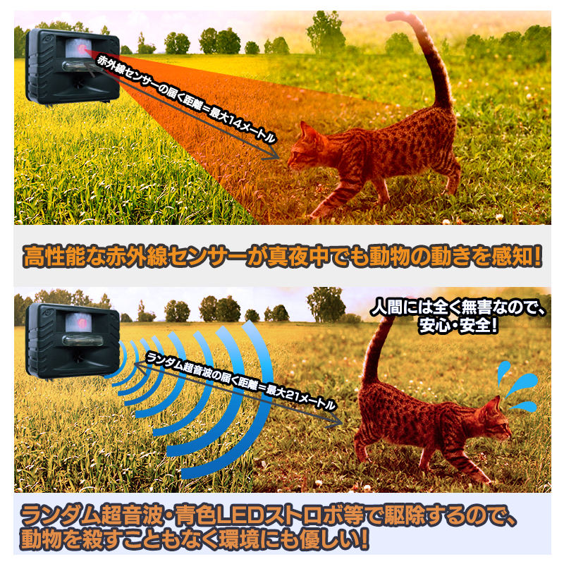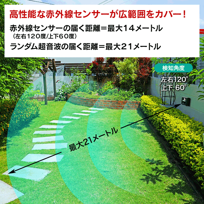 【ランダム超音波】の届く距離&【赤外線センサー】感知範囲は、どちらも、旧型タイプのアニマルリペラーの1.5倍にパワーアップ!【ランダム超音波】の届く距離:最大21メートルまで届きます(【ランダム超音波】有効範囲:最大140坪(障害物のない場合))【赤外線センサー】感知範囲:最大14メートル(調整可能)、左右120度/上下60度