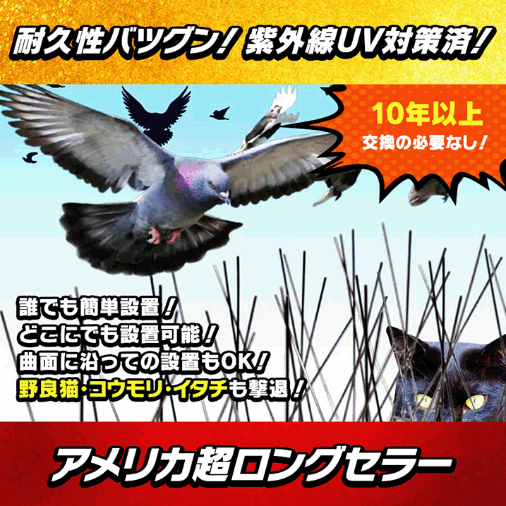 野良猫・野良犬を初め、どの害獣・害鳥も、みな、Newバード・スパイクのような“物理的な障害物”を避け寄り付かなくなる『学習能力』を持っているので、Newバード・スパイクは、害獣・害鳥の対策にたいへん効果的で優れています!
