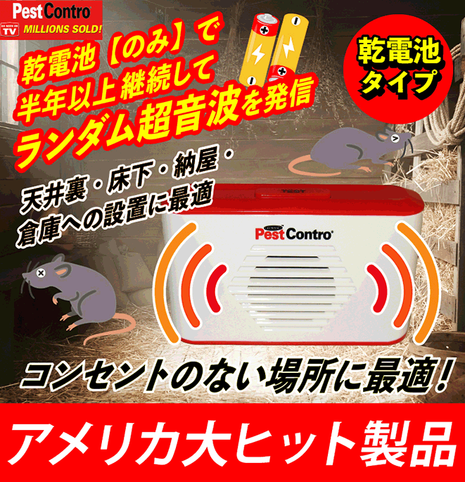 コンセントのない場所でも、単3乾電池3本【のみ】で【半年以上】も、【継続的に全自動で】ランダム超音波を発信し、ネズミ害虫を駆除できる、たいへん便利な、『アメリカ大ヒット製品』【Newペストコントロ】シリーズ中、唯一の【乾電池タイプ】です!