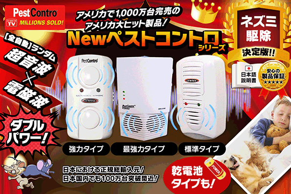 『アメリカ大ヒット製品』【Newペストコントロ】シリーズ(「コンセント差し込み式」の基本3機種)は、ランダム超音波&電磁波の「強力ダブル・パワー」によりネズミ害虫を駆除する優れた製品でありますが、