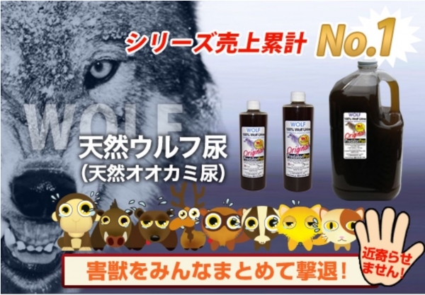 アニマルピーNo.1(天然ウルフ尿=天然オオカミ狼尿)は、ウルフ(=オオカミ狼)を「天敵」として本能的に避ける先天的習性(獣尿の“マーキング効果”)を利用し、猿(サル/さる)、猪(イノシシ/いのしし)、鹿(シカ/しか)、ハクビシン、野良猫(ネコ/ねこ)、きつね、熊(クマ/くま)等の害獣を傷つけずに寄せ付けなくする製品です。