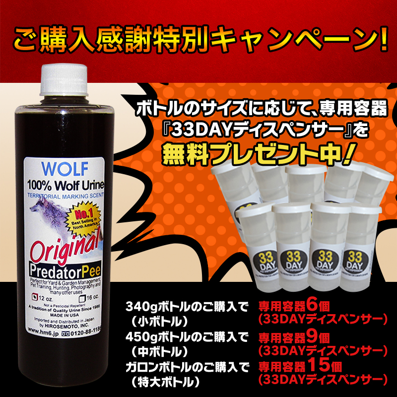 ※無料特典:アニマルピーNo.1(天然ウルフ尿=天然オオカミ狼尿)を購入されたお客様に、専用容器【33DAYディスペンサー】を無料プレゼント!