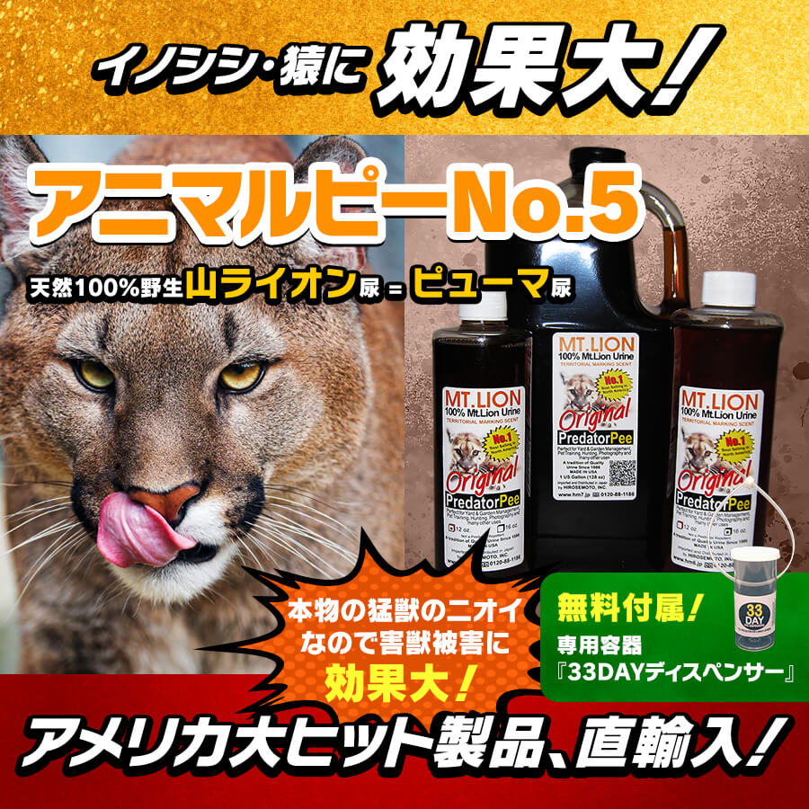 アニマルピーNo.5(天然ピューマ尿=天然山ライオン尿)は、山ライオン(ピューマ)を【天敵】として本能的に避ける先天的習性(獣尿の“マーキング効果”)を利用し、猪(イノシシ/いのしし)、猿(サル/さる)、鹿(シカ/しか)などの害獣を傷つけずに寄せ付けなくする製品です。